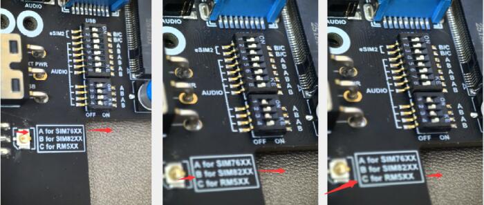 Different model versions correspond to different DIP switches. Set the C-labeled switch to ON; it can be used for the RM520N-GL / RM530X / EM06X series 5G / LTE-A M.2 modules. For customers using RM520/530, please turn on all the C switches so that the SIM card can be recognized and network connection can be established properly.
