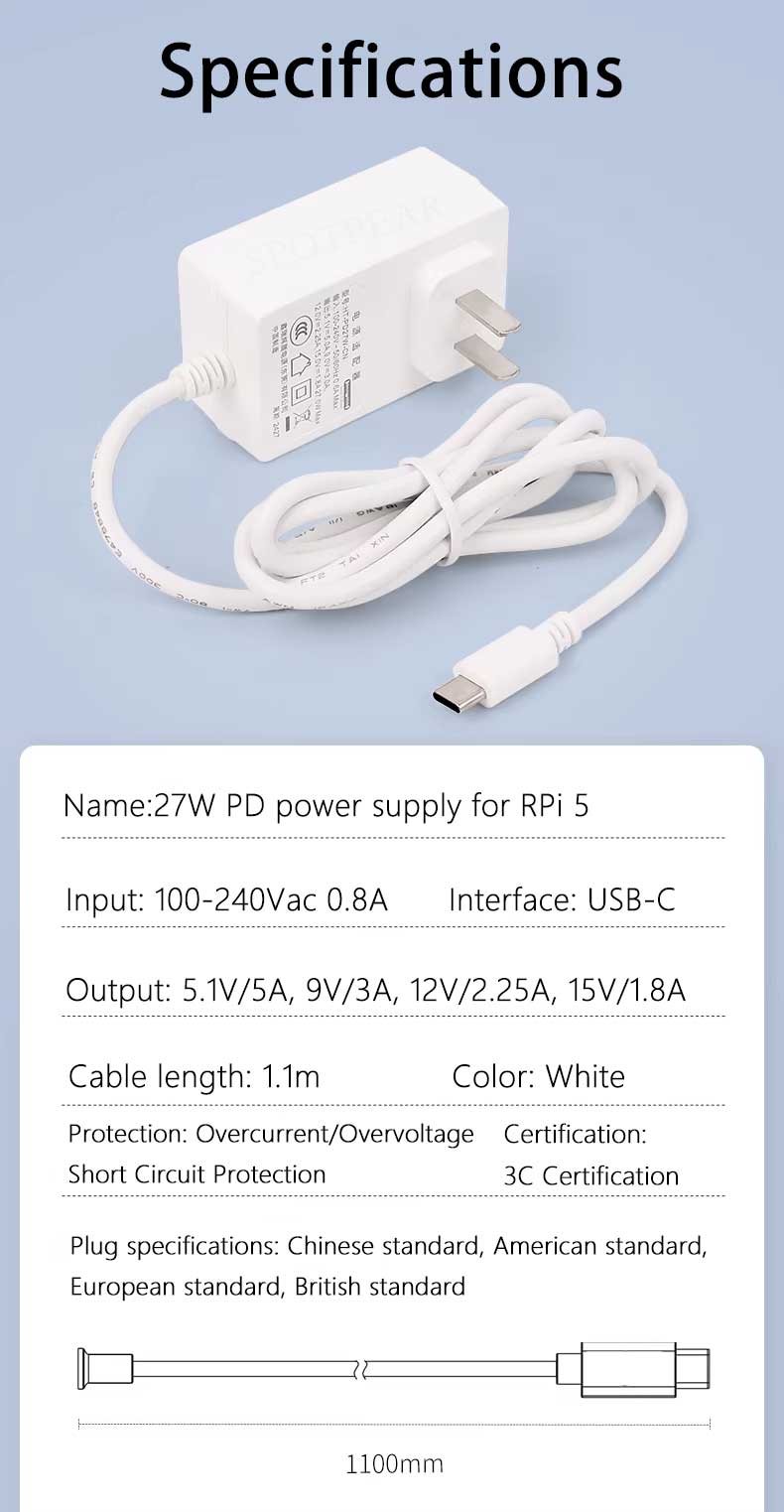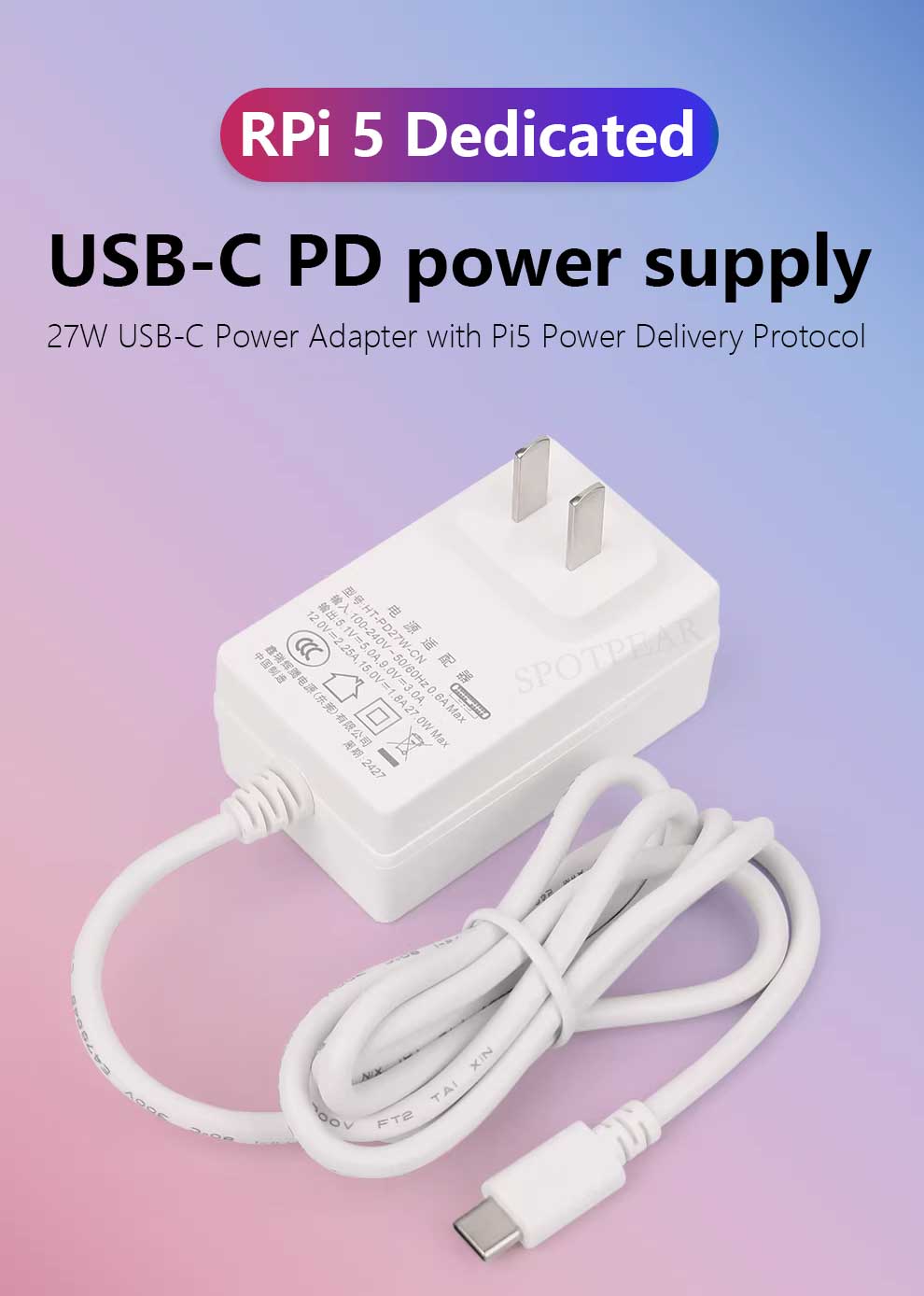 Raspberry Pi 5 Power 27W USB Type-C 5V5A PD Power Supply for Pi5