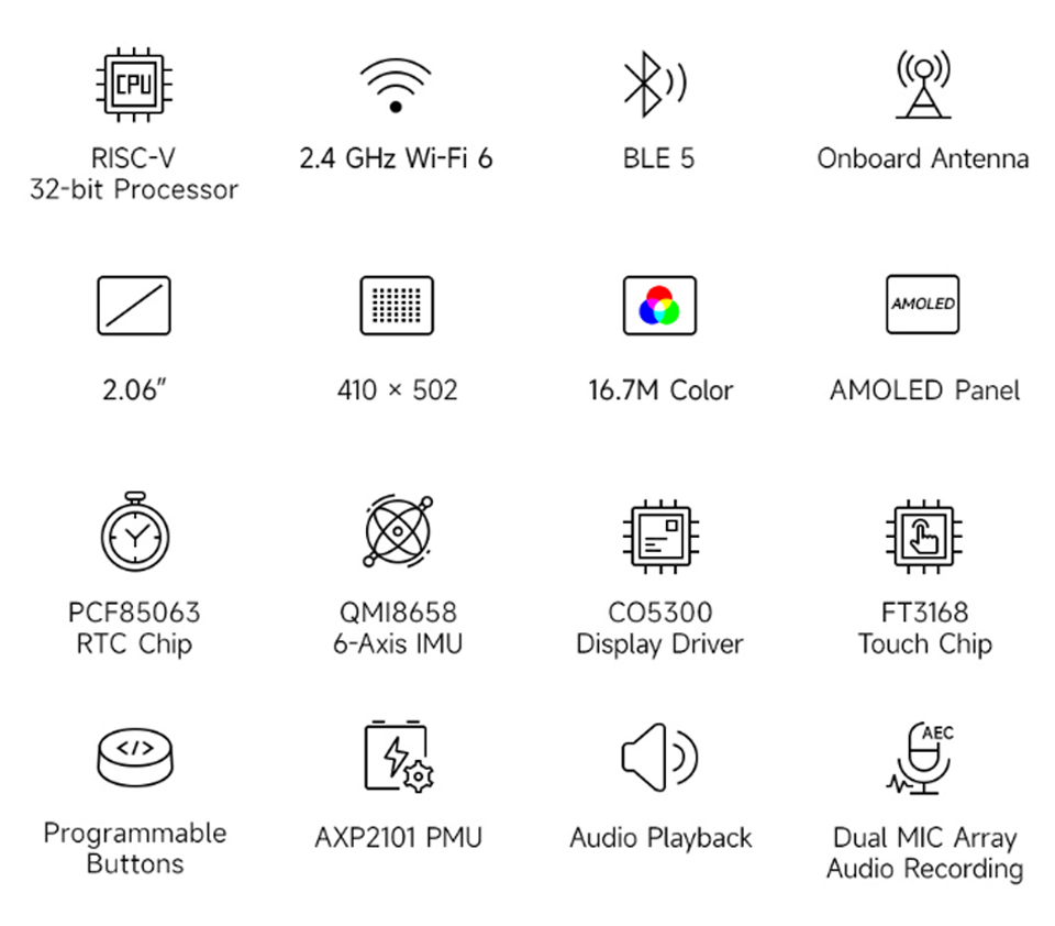 The ESP32-C6 is a 2.06-inch AMOLED smartwatch touch development board with a 410×502 resolution. It supports Wi-Fi 6, Bluetooth 5, and Zigbee, and also supports Xiaozhi AI DeepSeek.