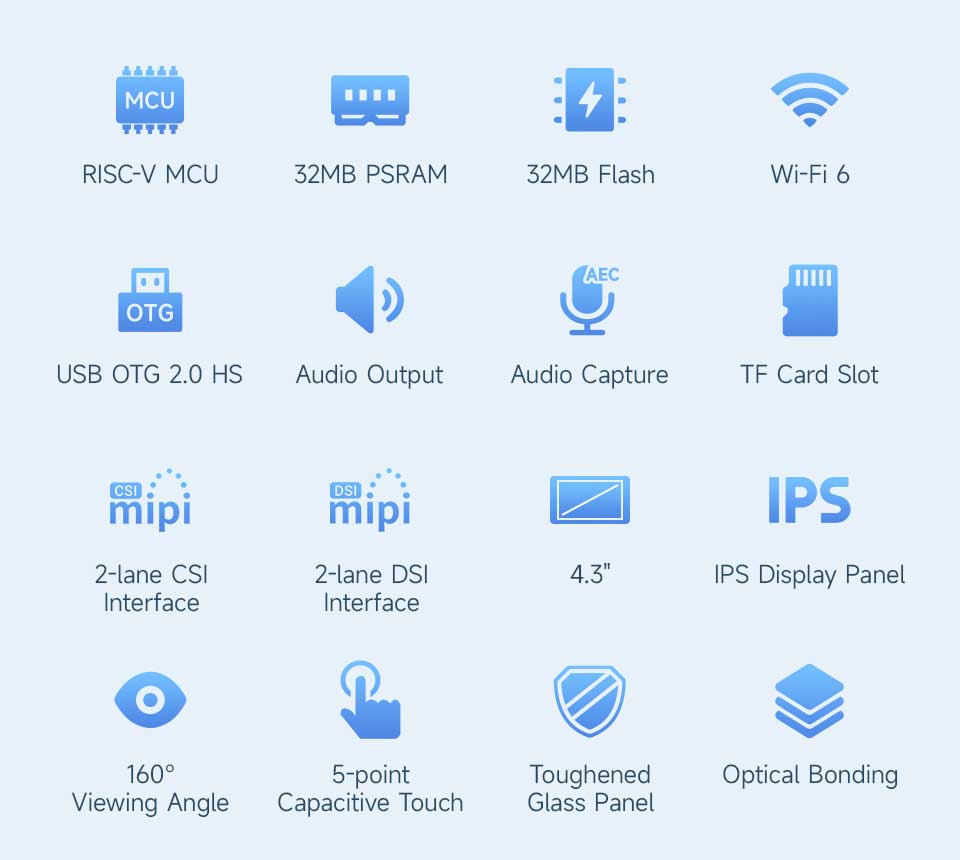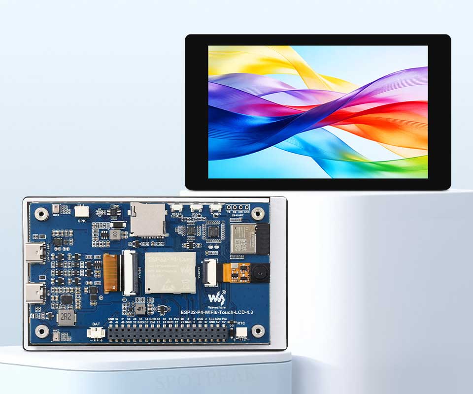 The ESP32-P4-WIFI6-Touch-LCD-4.3 is a high-performance development board based on ESP32-P4 controller with RISC-V 32-bit dual-core and single-core processors. Equipped with 4.3inch 480 × 800 resolution IPS touch display, features rich human-machine interfaces including MIPI-CSI (with integrated Image Signal Processor), it also supports USB OTG 2.0 HS for high-speed connectivity and features an onboard 40PIN GPIO expansion header, compatible with some Raspberry Pi HATs for broader application adaptability.