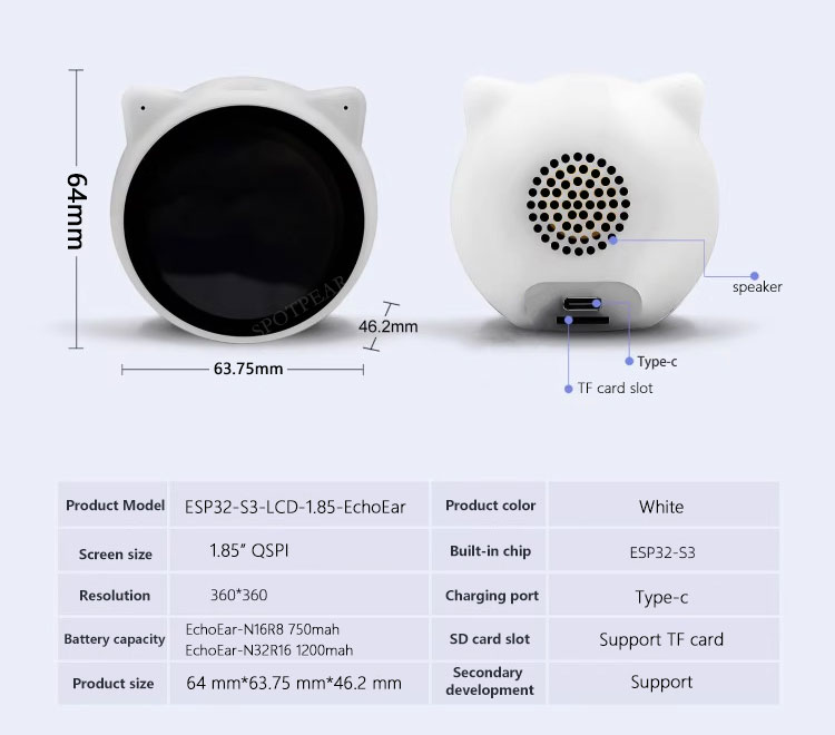 EchoEar ESP32 S3 AI Development Board with 1.85-inch LCD Display Cute Cat Pet Chatting Robot N32R16