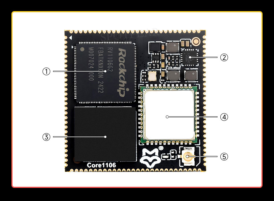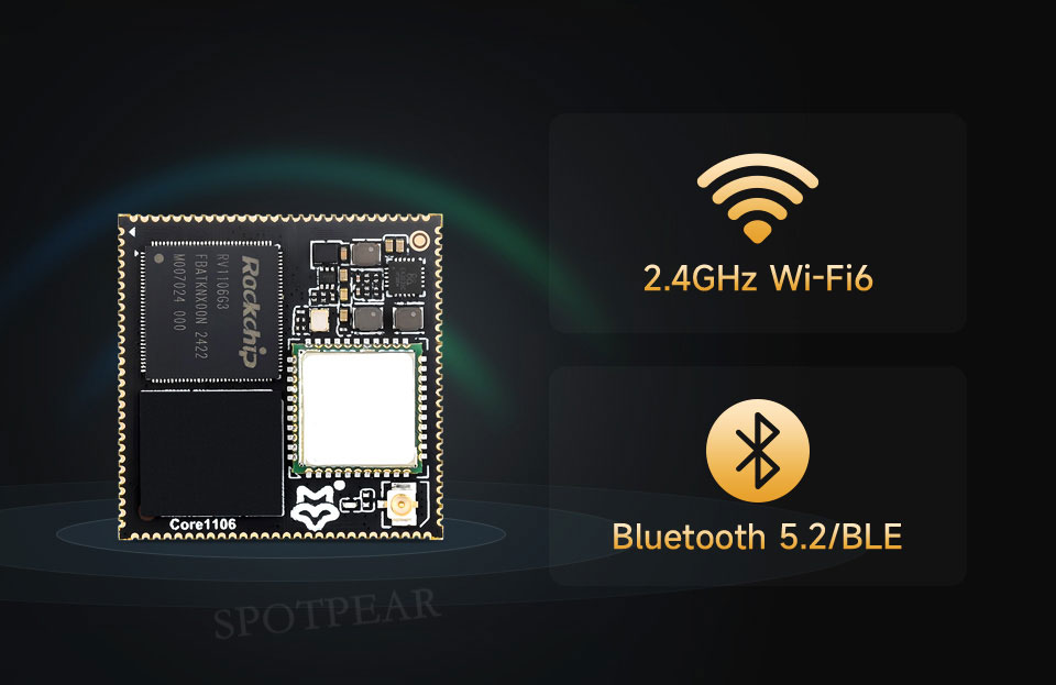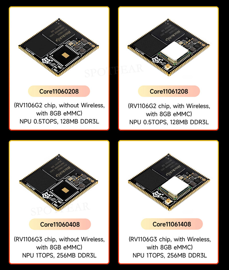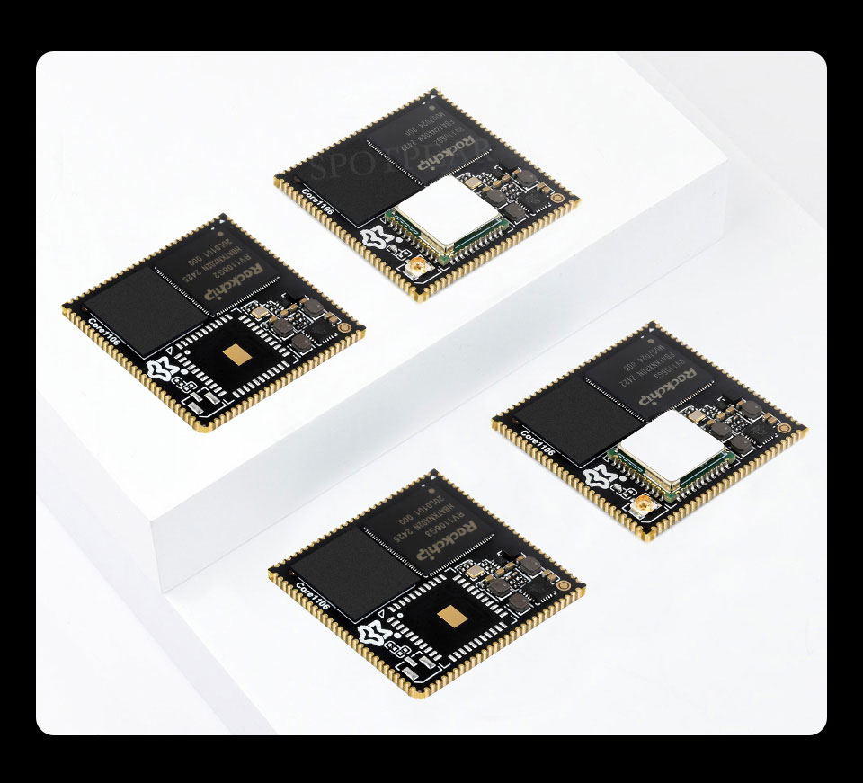 This product is a high-performance and highly scalable core board based on Rockchip's RV1106 series chips. It is designed to provide developers with convenience for independent hardware design, and can quickly verify the design solution or directly apply it to the product, shortening the R&D cycle. The core board leads to multiple interfaces such as MIPI CSI, RGB LCD, GPIO, UART, SPI, I2C, USB, Ethernet and SDIO through stamp hole connection, which is suitable for a variety of application scenarios. Wireless modules are optional, and two core options, RV1106G2 and RV1106G3, are provided to meet different needs.