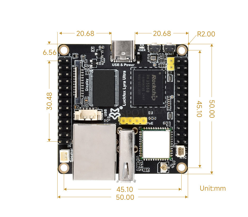 Luckfox Lyra Ultra series is a micro Linux development board based on Rockchip RK3506B chip, designed to provide developers with a simple and efficient development platform. This product supports a variety of high-speed interfaces, including MIPI DSI, RMII, DDR and USB, which can meet a variety of application scenarios. The low-speed interface adopts Rockchip Matrix IO design, so that the pins supporting this design share 98 multiplexing functions, and can freely combine PWM, UART, I2C, SPI and I2S, etc., which is convenient for rapid development and debugging.