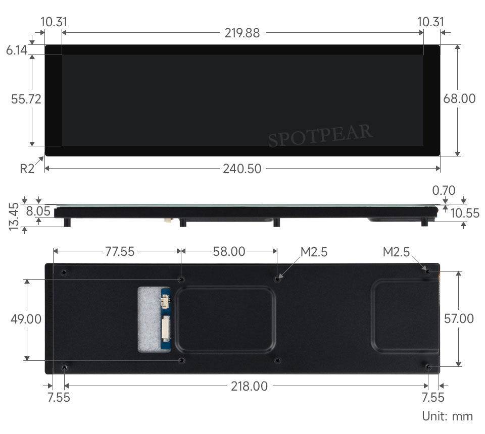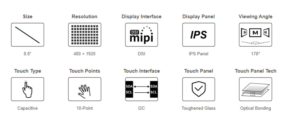 8.8inch DSI Capacitive Touch Display, IPS Panel, 480 × 1920 Resolution, 10-Point Touch, Supports Backlight Adjustment Via Software