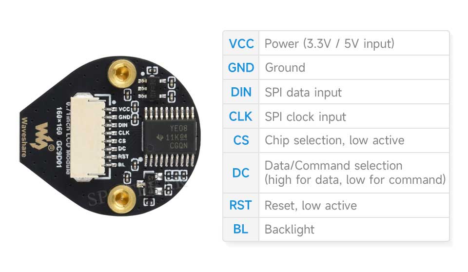 IPS Panel, 160×160 Resolution, Embedded GC9D01 Driver, Using SPI Bus