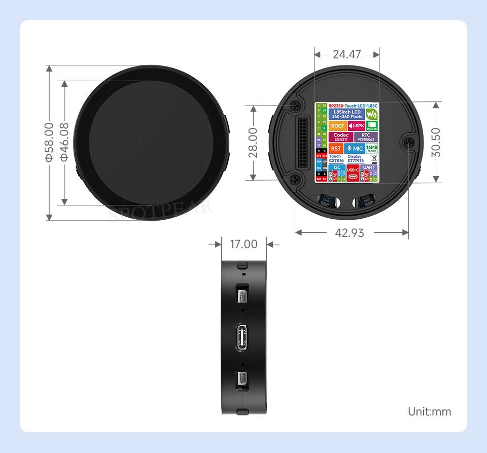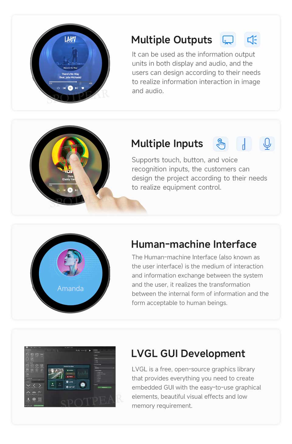 • Onboard 1.85inch capacitive touch LCD, 360 × 360 resolution, 65K color
