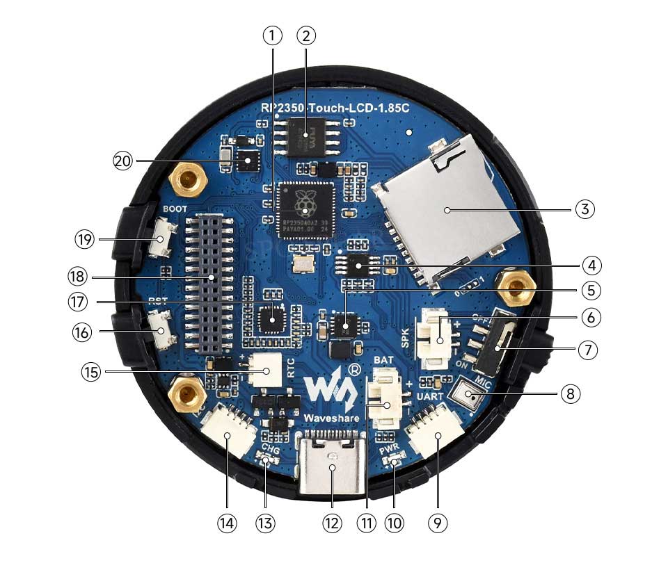 The RP2350-Touch-LCD-1.85C is a high-performance, highly integrated microcontroller development board designed by Waveshare. Tiny size with onboard 1.85inch capacitive IPS display, RTC chip, TF card slot, and other peripherals for easy development and integration into products.
