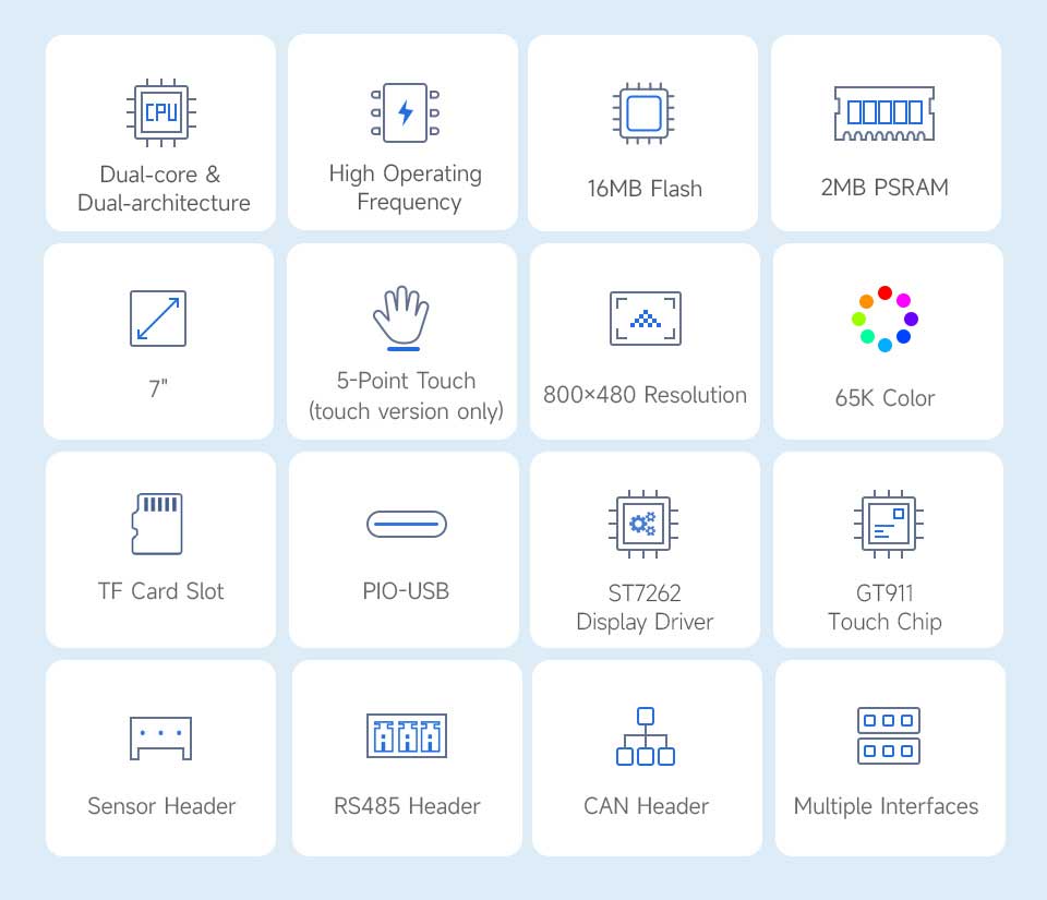 This product is a high-performance, highly integrated microcontroller development board designed by Waveshare. It integrates high-capacity Flash and PSRAM. Onboard 7inch capacitive LCD display, TF card slot, PIO-USB, and so on, combined with various communication interfaces for easy development and integration into products.