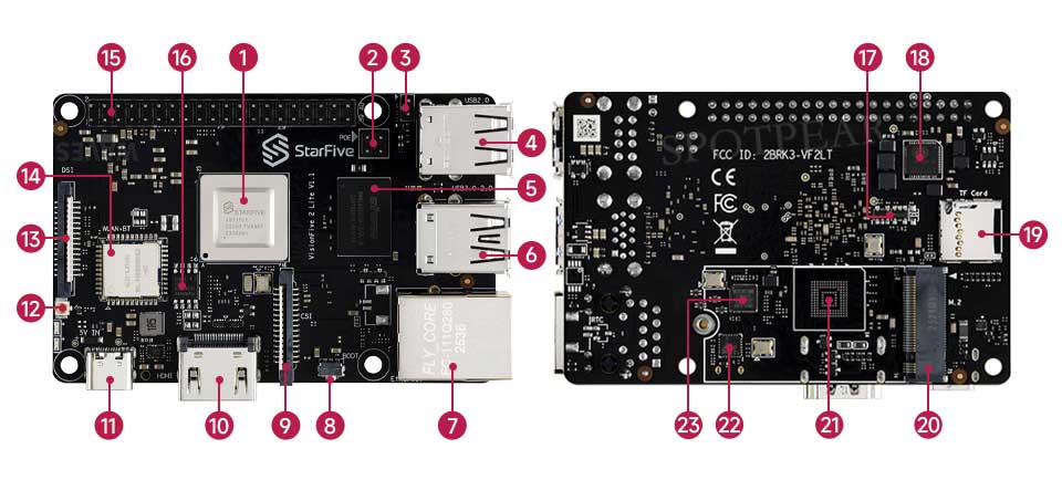| CPU | StarFive JH-7110 with RISC-V U74 quad-core CPU with 2 MB L2 cache and a S7 core, supporting RV64GC ISA, working up to 1.5 GHz | StarFive JH-7110S with RISC-V quad-core CPU with 2 MB L2 cache and a monitor core, supporting RV64GC ISA, working up to 1.25 GHz |