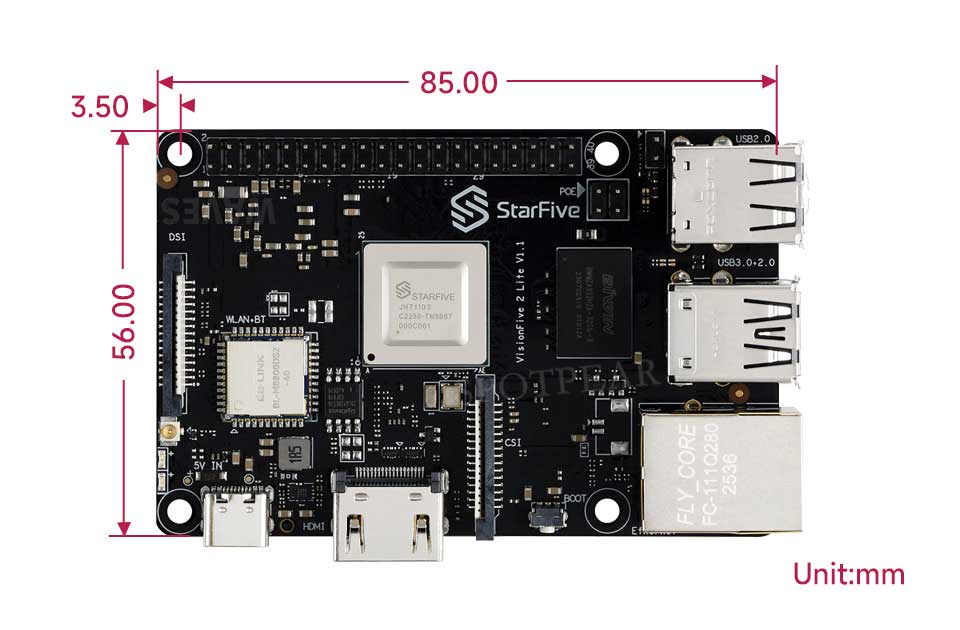 | PROCESSOR | StarFive JH-7110S | StarFive JH-7110S with RISC-V quad-core CPU with 2 MB L2 cache and a monitor core, supporting RV64GC ISA, working up to 1.25 GHz |
