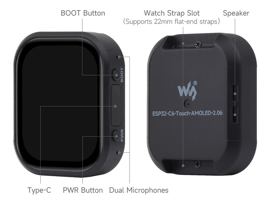 ESP32-C6-Touch-AMOLED-2.06 is a high-performance, wearable watch-shaped development board launched by Waveshare. The product is based on the ESP32-C6 microcontroller, integrating a 2.06inch capacitive touch HD AMOLED screen, a 6-axis IMU, RTC, an audio codec chip and power management and other functional modules. With a custom case, it looks and forms like a smart watch and is designed for prototyping and functional verification of wearable applications.