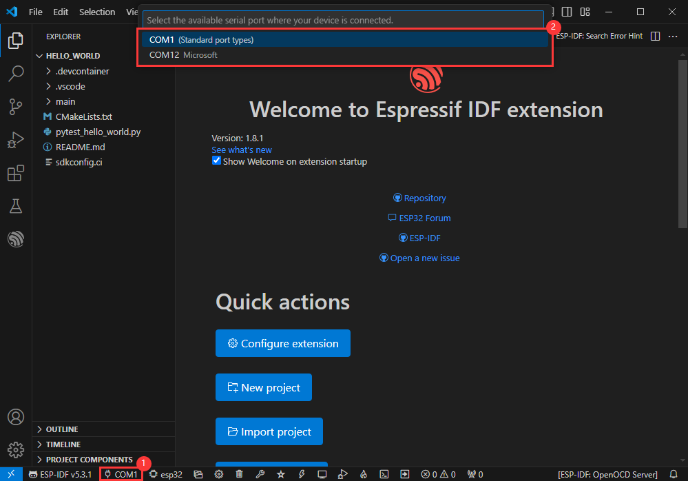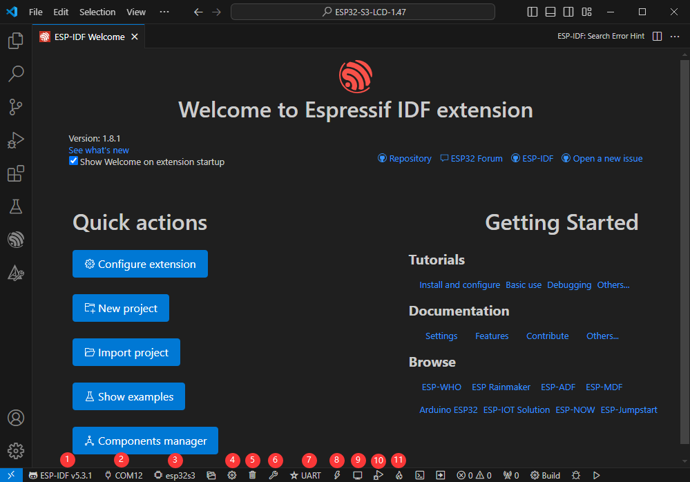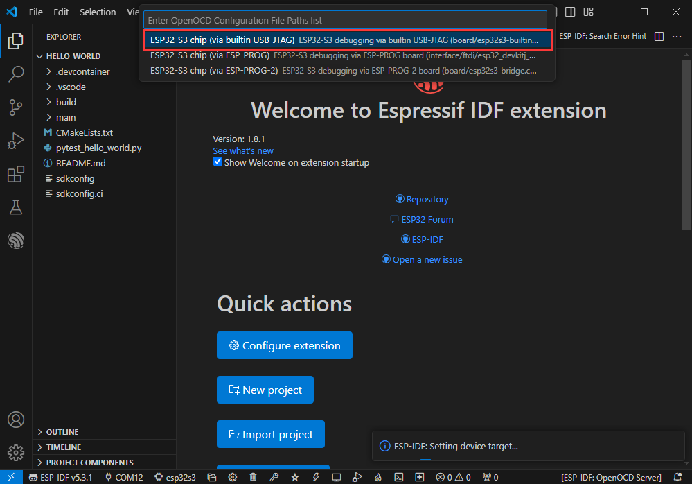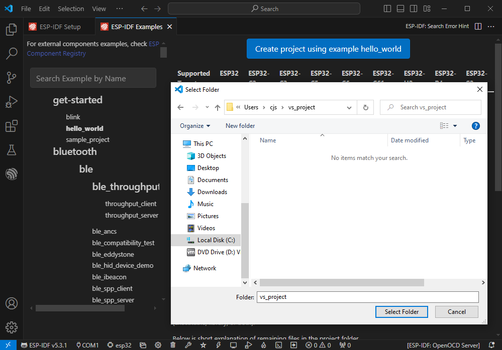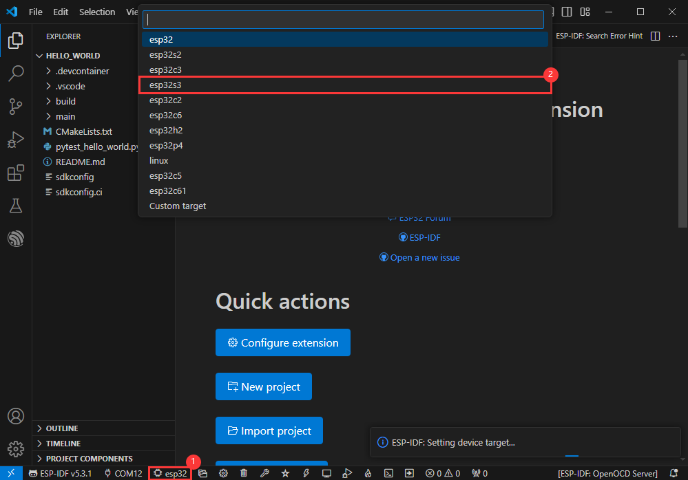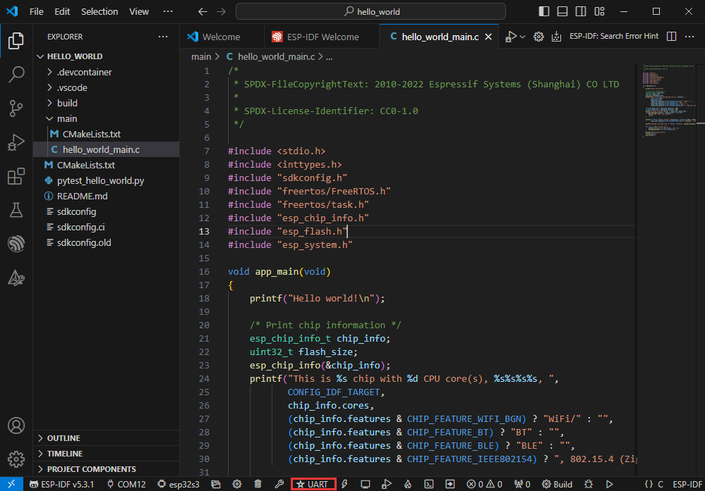 ESP-IDF, or full name Espressif IDE, is a professional development framework introduced by Espressif Technology for the ESP series chips. It is developed using the C language, including a compiler, debugger, and flashing tool, etc., and can be developed via the command lines or through an integrated development environment (such as Visual Studio Code with the Espressif IDF plugin). The plugin offers features such as code navigation, project management, and debugging, etc.