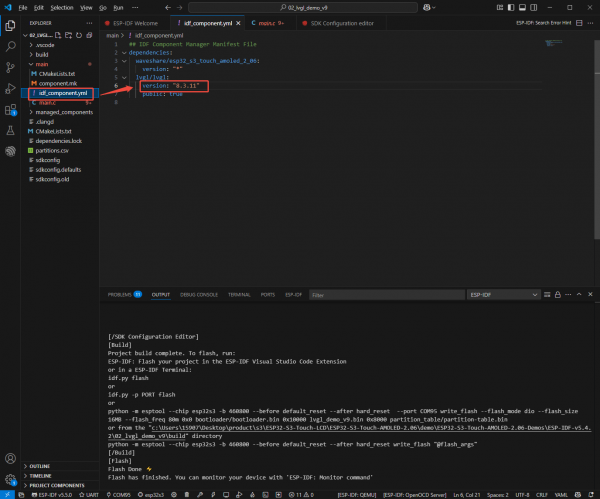 • Modify the LVGL component version in the yml file, changing the version number from 9.2.0 to 8.3.11