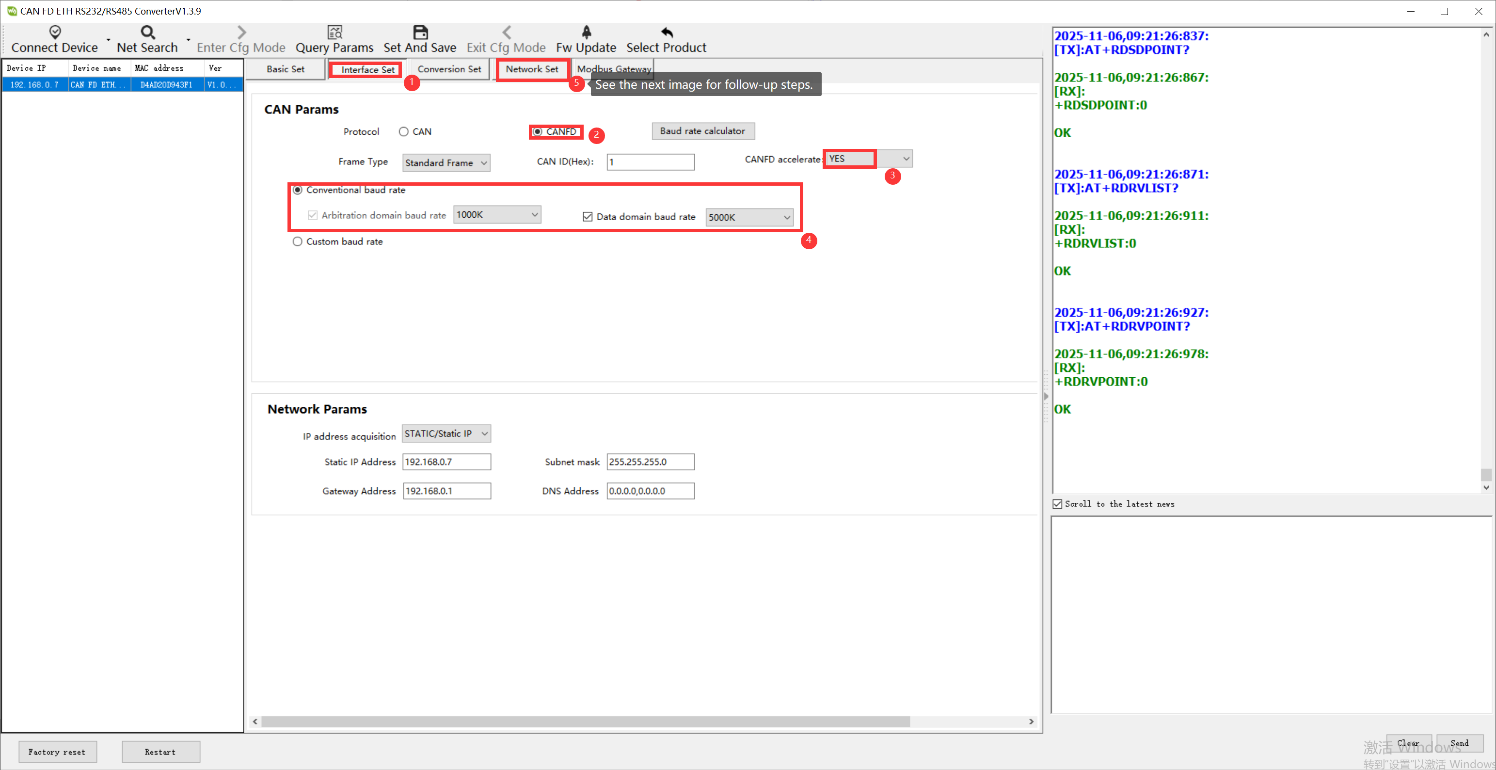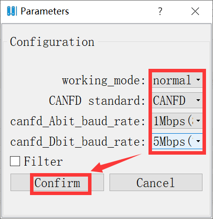 • Select "Normal" for working mode, "CANFD ISO" for CANFD standard, "1Mbps" for arbitration domain baud rate, "5Mbps" for data domain baud rate, and finally click "Conform"