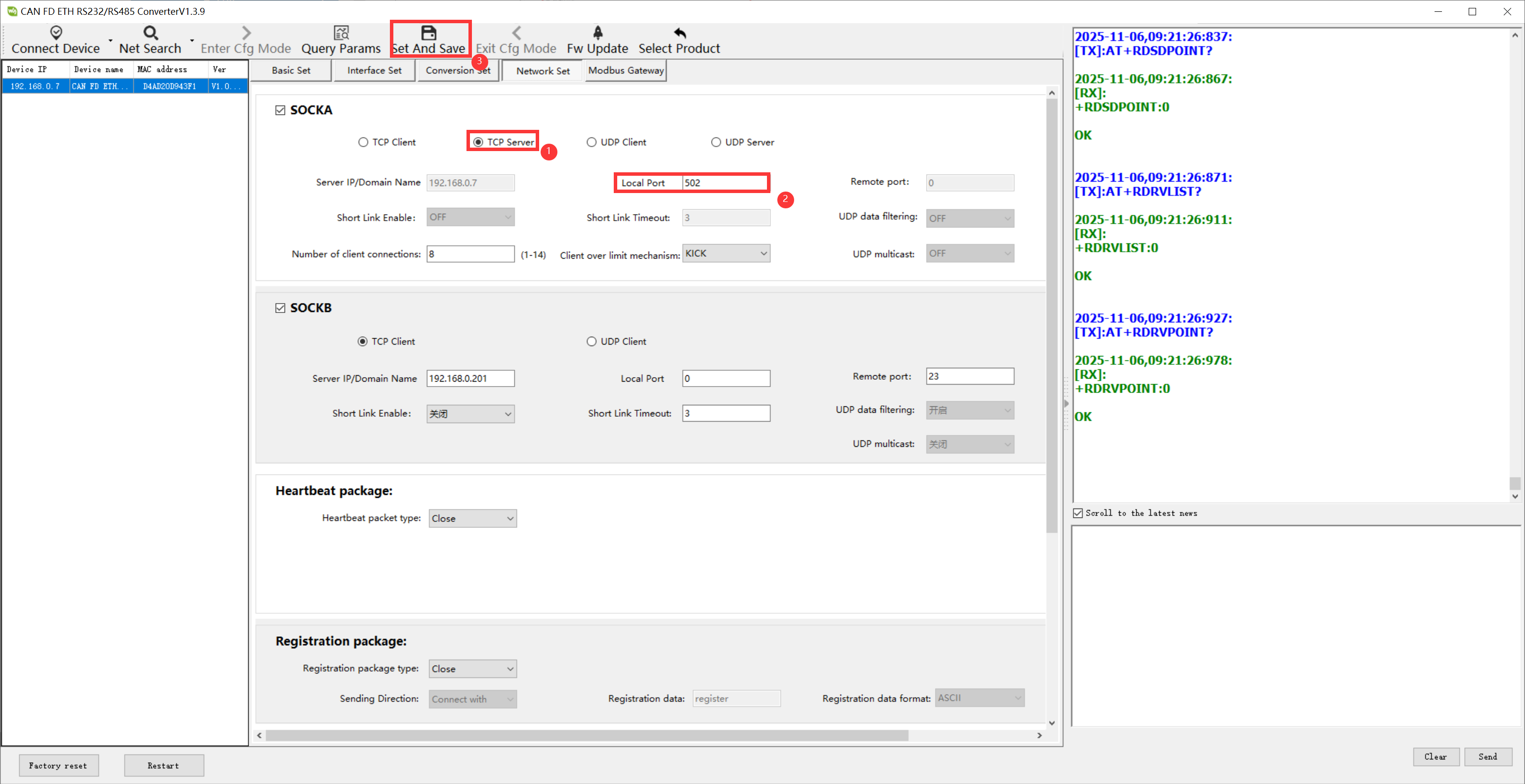 • Select TCP Server in network working mode, change the local port to 502, and finally click Set and Save to end the device configuration. The command on the right has an error and needs to be saved or reconfigured