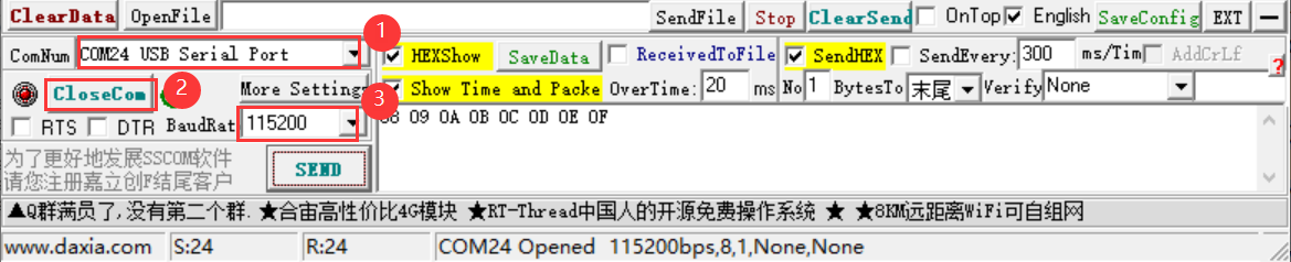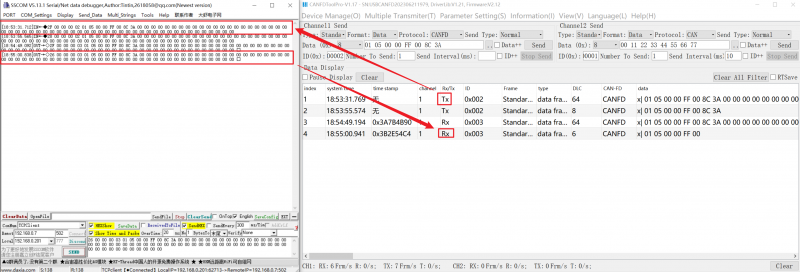 • USB_CANFD TOOL: Click to send message, send data 55 55 66 66 77 77 88 88. SSCOM software: Check HEX hexadecimal to receive data 55 55 66 66 77 77 88 88.