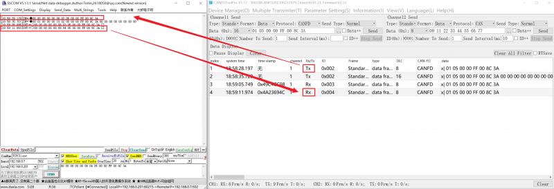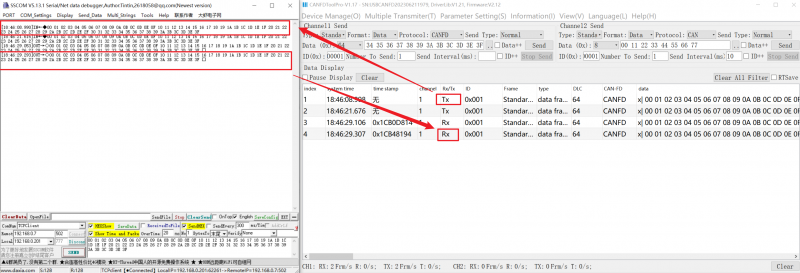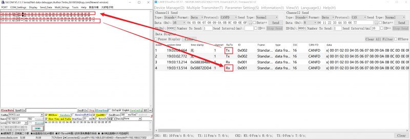 • SSCOM software: Click to send message, send data 11 11 22 22 33 33 44 44. USB_CANFD TOOL: Check HEX hexadecimal to receive data 11 11 22 22 33 33 44 44.