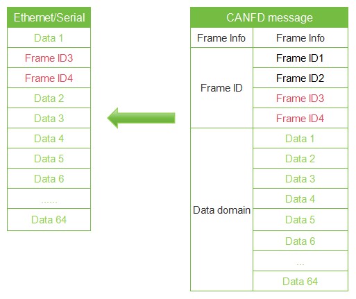 • The "Frame ID" of the CAN(FD) messages in the Ethernet data will be converted according to the pre-configured settings and mapped to the Frame ID field of the CAN(FD). If the length of the configured transparent conversion with ID is less than the frame ID length of the frame type in the CAN(FD) message, the high byte of the frame ID in the CAN(FD) message is padded with 0.