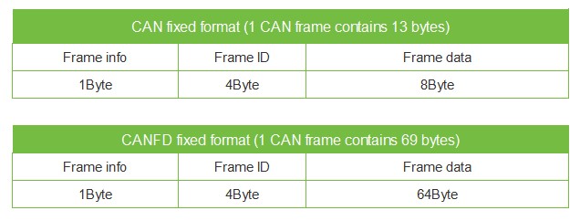 • Standard CANFD frame format, each CANFD frame contains 69 bytes, including CANFD frame information (1 byte) + frame ID (4 bytes) + data frame (64 bytes).