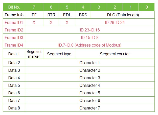 The address field of the Modbus protocol is converted into the ID4 (extended frame) or ID2 (standard frame) of the frame ID in the CAN message, and the identifier remains unchanged during the conversion of this frame.