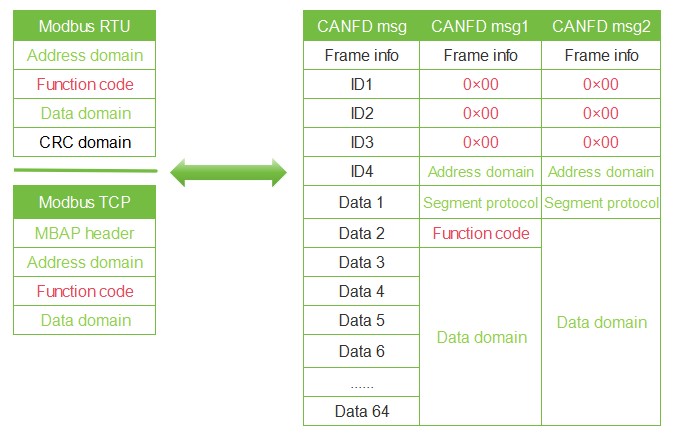 The conversion involves the Modbus protocol content—function code and data field—where they are sequentially converted into the data field of a CAN message frame (starting from the second data byte, with the first data byte used for segmented protocol). Since the length of Modbus frame varies depending on the function code, while a CAN message frame can only transmit 7 data, and a CANFD message frame can only transmit 63 data. Therefore, the converter will convert the longer Modbus frame segments into CAN messages and send them using the CAN fragmentation protocol described above. Users can process the function code and data field when receiving them on the CAN node.
