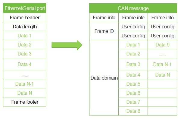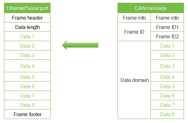 • Ethernet frame to CAN message: All data from Ethernet frames is sequentially filled into the data field of CAN message frame. As soon as the converter detects data on the Ethernet, it immediately receives and converts it. The frame information (frame type section) and frame ID need to be pre-configured.