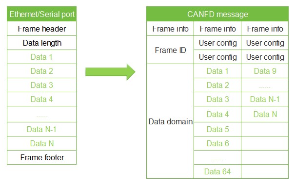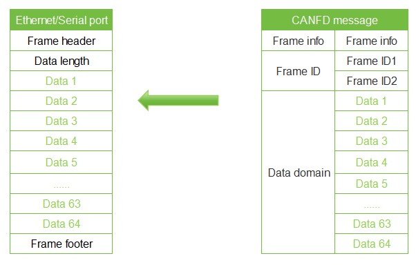 The CAN(FD) bus message forwards one frame for every frame received. The module will sequentially convert the data in the CAN message data field, while automatically adding frame header, frame length, frame information, and other data to the Ethernet frame. This is essentially the reverse form of converting an Ethernet frame to a CAN message.