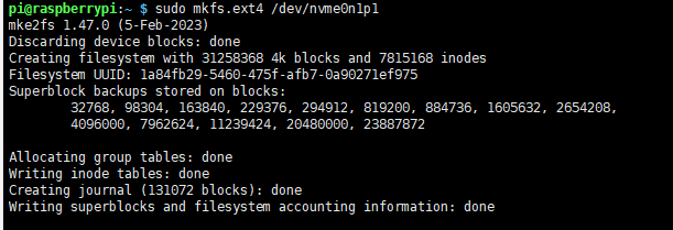 sudo mkfs. Execute the command and press Tab key, you will see a lot of different suffixes, and the different suffixes are the formats you need to formatIf I want to format it in ext4 file format, then execute the command: sudo mkfs.ext4 /dev/nvme0n1p1 Wait a moment, once all "done" appear as below, it indicates that the formatting is completed
