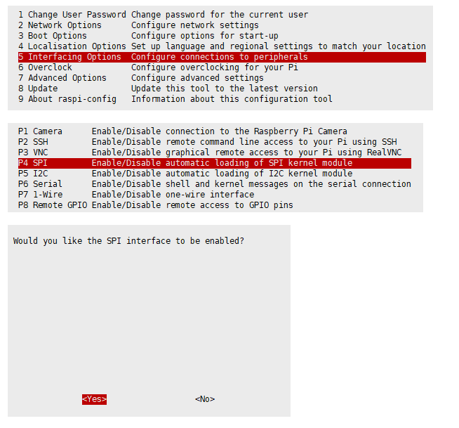 sudo raspi-config Select Interfacing Options -> SPI -> Yes to enable the SPI interface