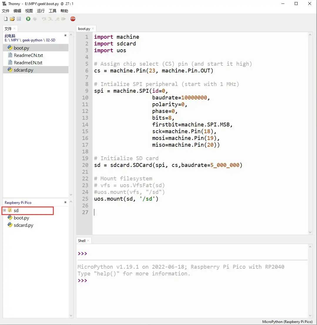 • Uses SPI to communicate with the TF card and mounts the TF card to the development board. After successful mounting, you can view and modify the contents of the TF card via Thonny.