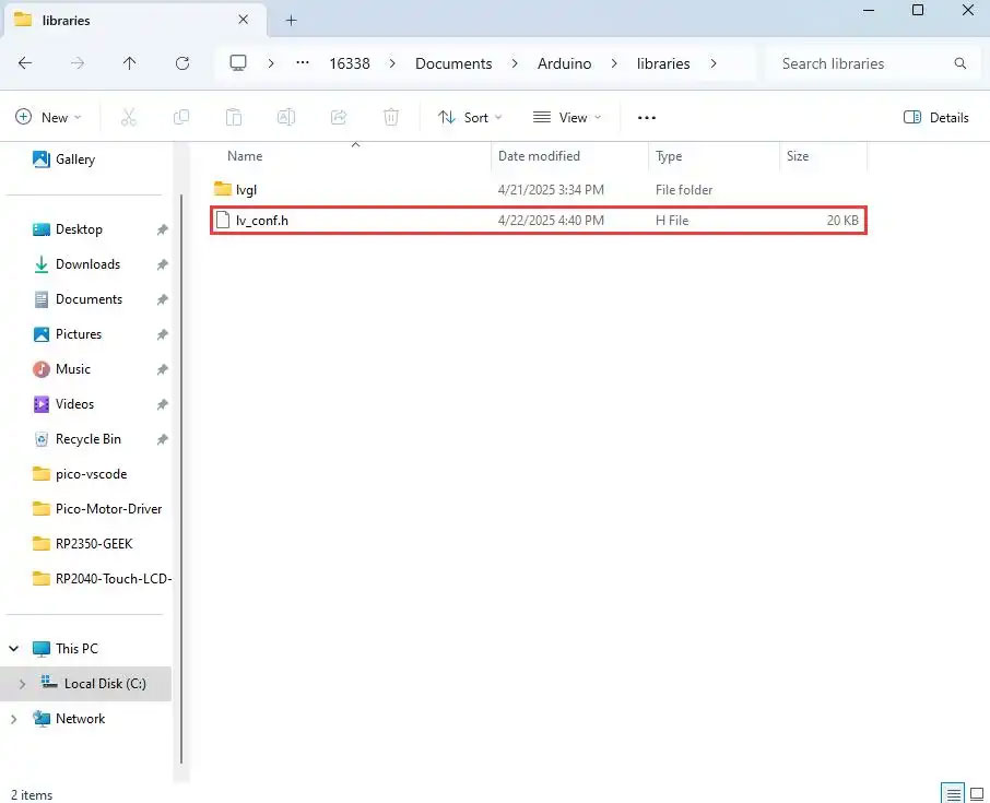 3. Download the program package and copy Arduino\lv_conf.h from the package to your local Arduino library directory.