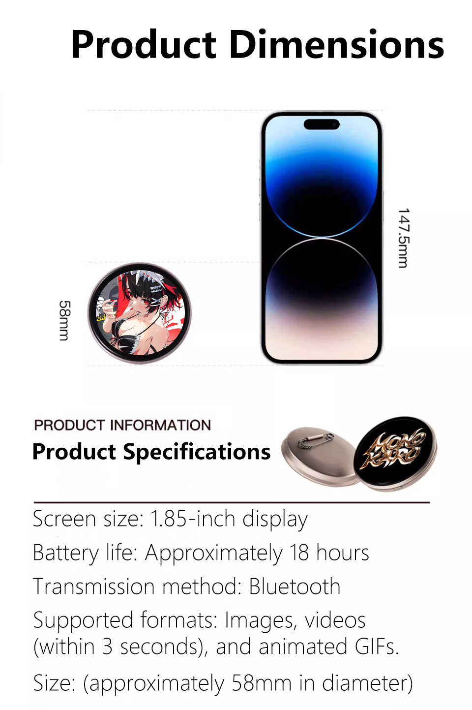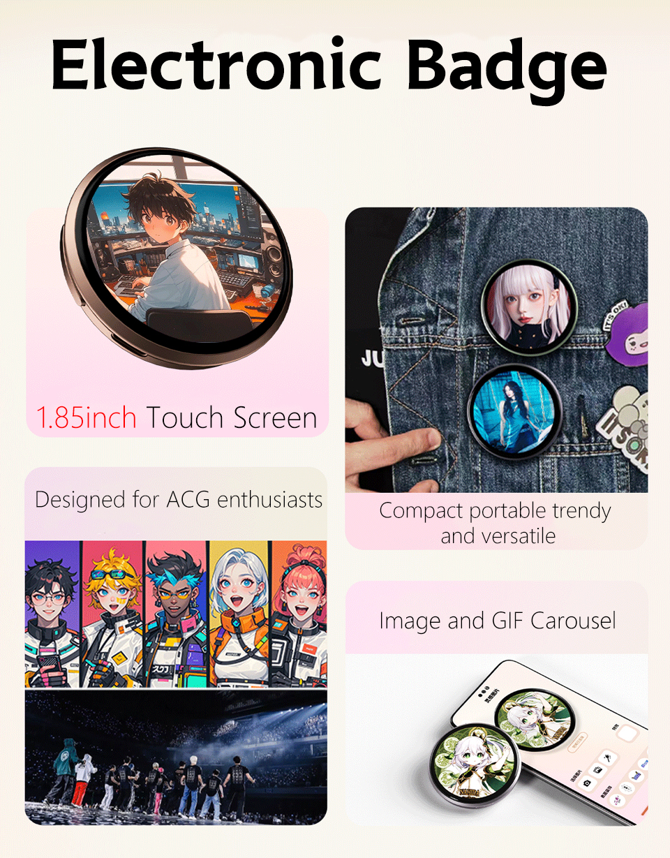 1.85-inch Round LCD Electronic Badge Display 1.85inch TouchScreen Speaker Concert Anime Convention Brooches