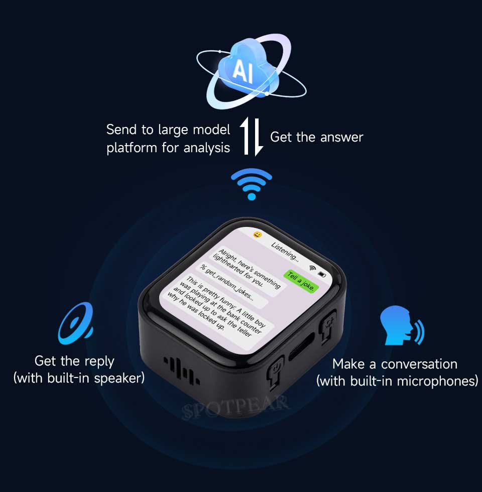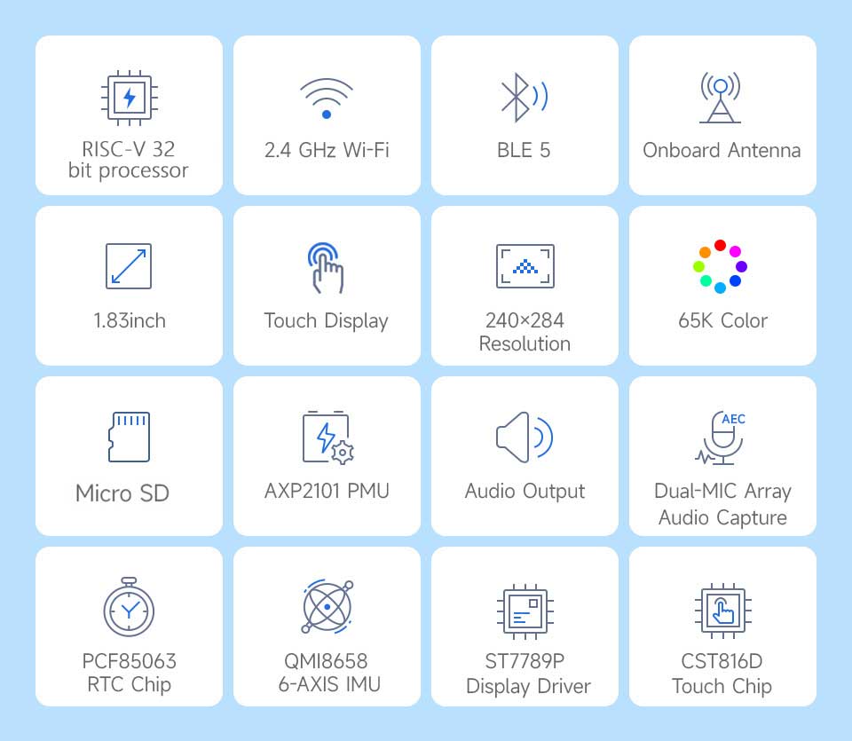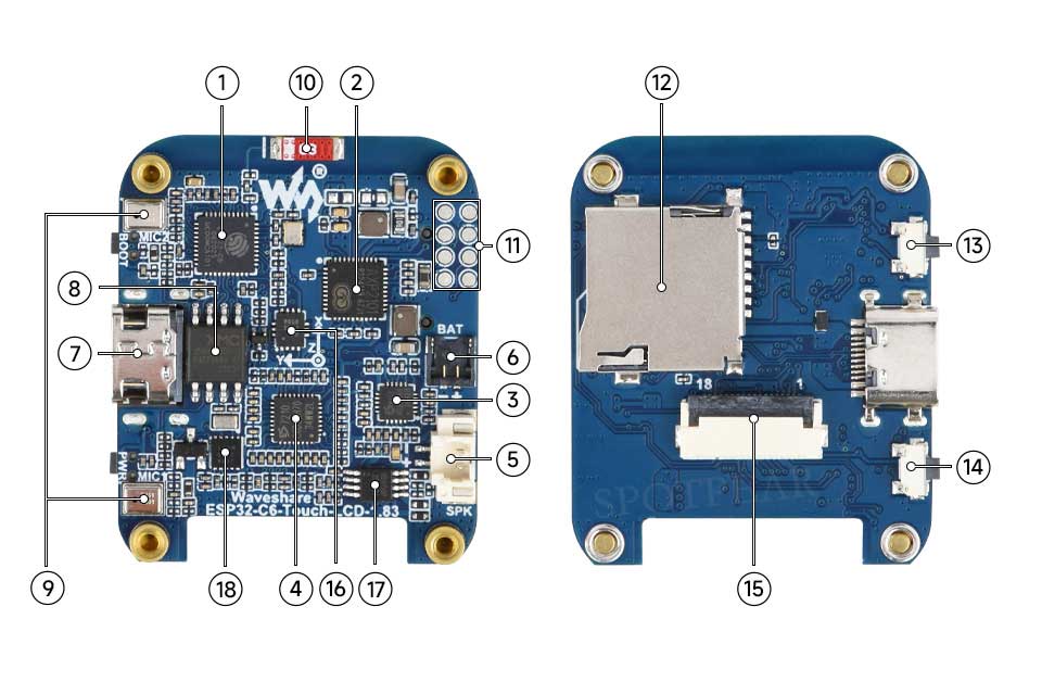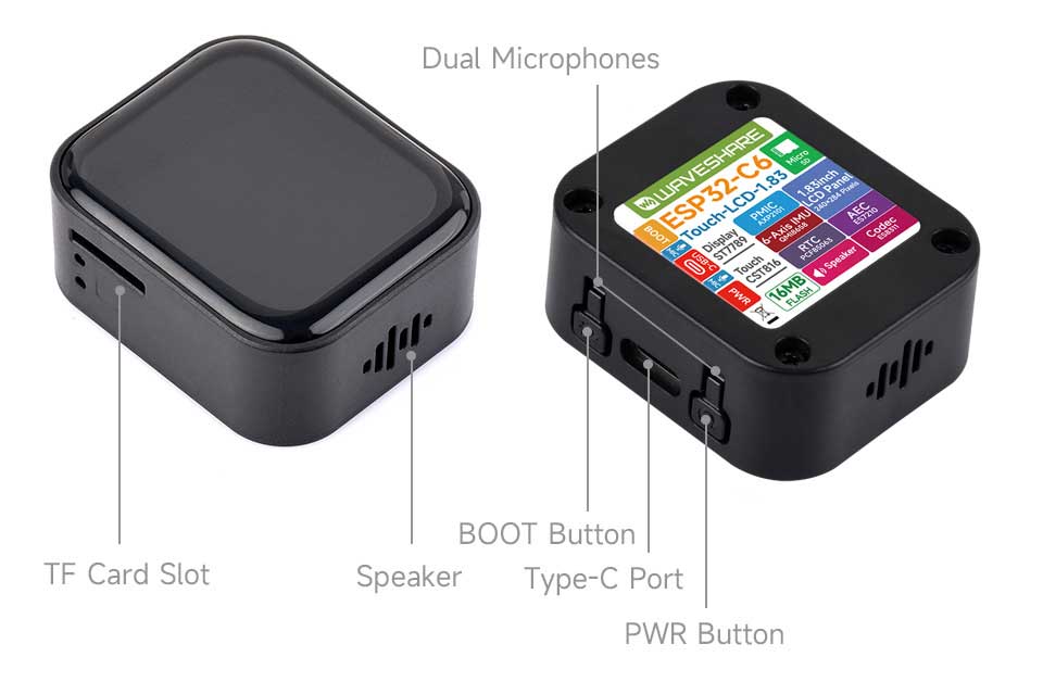 ESP32-C6-Touch-LCD-1.83 is a low-cost, high-performance microcontroller development board designed by Waveshare. In a compact form factor, it integrates a 1.83-inch capacitive touch LCD screen, lithium battery charging chip, audio codec chip, six-axis sensor (3-axis accelerometer and 3-axis gyroscope), RTC, and other peripherals. It is specifically engineered for prototyping and functional verification of AI voice conversation agents in wearable applications.