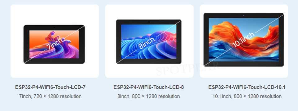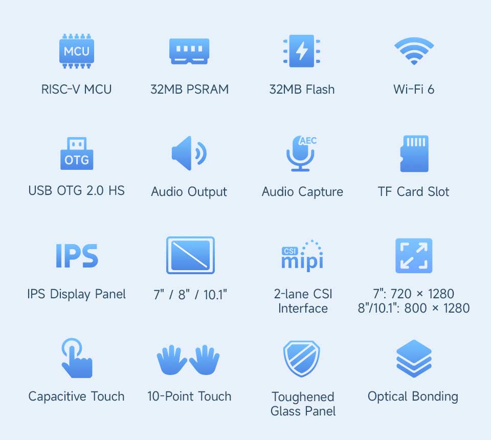 This product series is a high-performance development board based on ESP32-P4 controller with RISC-V 32-bit dual-core and single-core processors. Equipped with 7 / 8 / 10.1 inch IPS touch display, features rich human-machine interfaces including MIPI-CSI (with integrated Image Signal Processor), it also supports USB OTG 2.0 HS for high-speed communication.