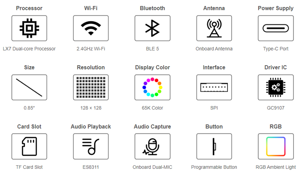 • Onboard 0.85inch LCD display, 128 × 128 resolution, 65K color