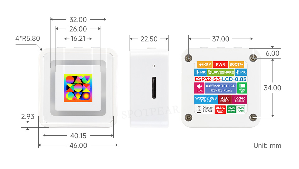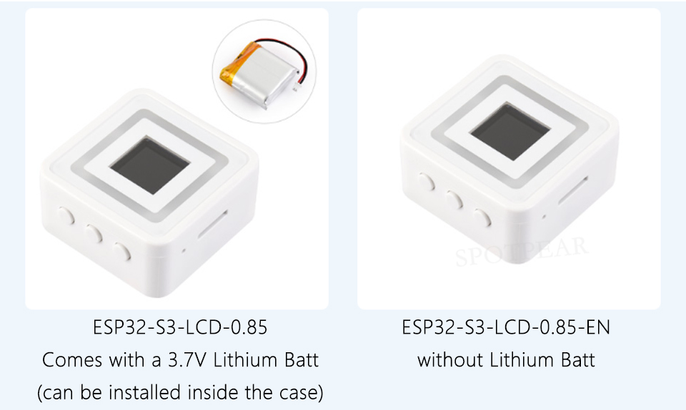 The ESP32-S3-LCD-0.85 is a microcontroller development board that supports 2.4GHz Wi-Fi and Bluetooth BLE 5. It features a custom-molded square plastic case, offering a compact and premium appearance. Onboard 0.85inch IPS color LCD display, TF card slot, 8 × surround RGB LEDs, low-power audio codec chip, and so on, enabling convenient development of multimedia and interactive applications. With these hardware resources, this product supports functions such as image display, audio playback, and lighting effects control, making it suitable for rapid prototyping and integration into end products for customized expansion and secondary development.