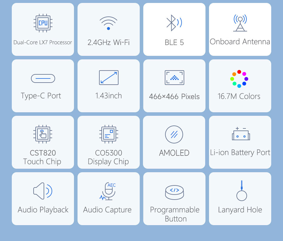 ESP32-S3-Touch-AMOLED-1.43C is a low-cost, high-performance microcontroller development board launched by Waveshare. It adopts the compact and highly integrated ESP32-S3-PICO-1-N8R8 as the main control chip, integrating a 1.43-inch capacitive touch HD AMOLED display, an audio codec chip, power management and other functional modules, and is specially designed for prototype development and functional verification of AI applications and voice dialogue intelligent agents.