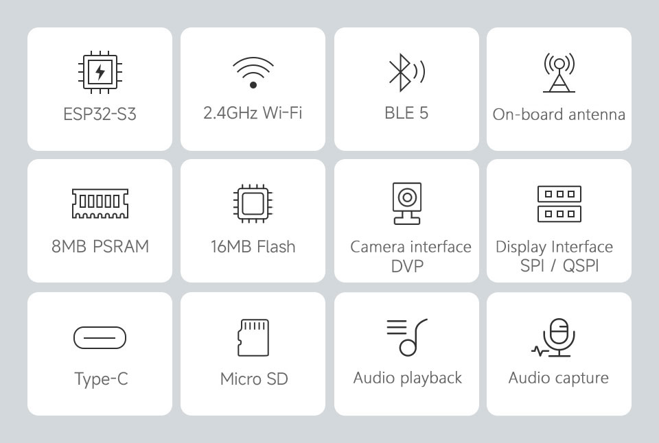 • Built-in 512KB SRAM, 384KB ROM, and onboard 8MB PSRAM + 16MB Flash.