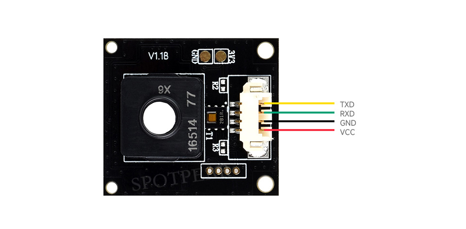 - Supports UART communication with 9600bps baud rate, 8 data bits, 1 stop bit, and no parity bit