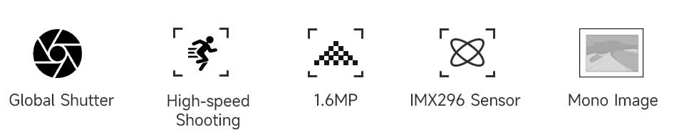 This IMX296 mono global shutter camera module is based on the IMX296 sensor with 1.6MP resolution. It is capable of capturing fast moving objects without Jelly-Effect of rolling shutter, ideal for fast motion photography and machine vision applications. Adopts M12 lens offering 130° FOV, comes with dual FFC cables, compatible with all Raspberry Pi series boards.