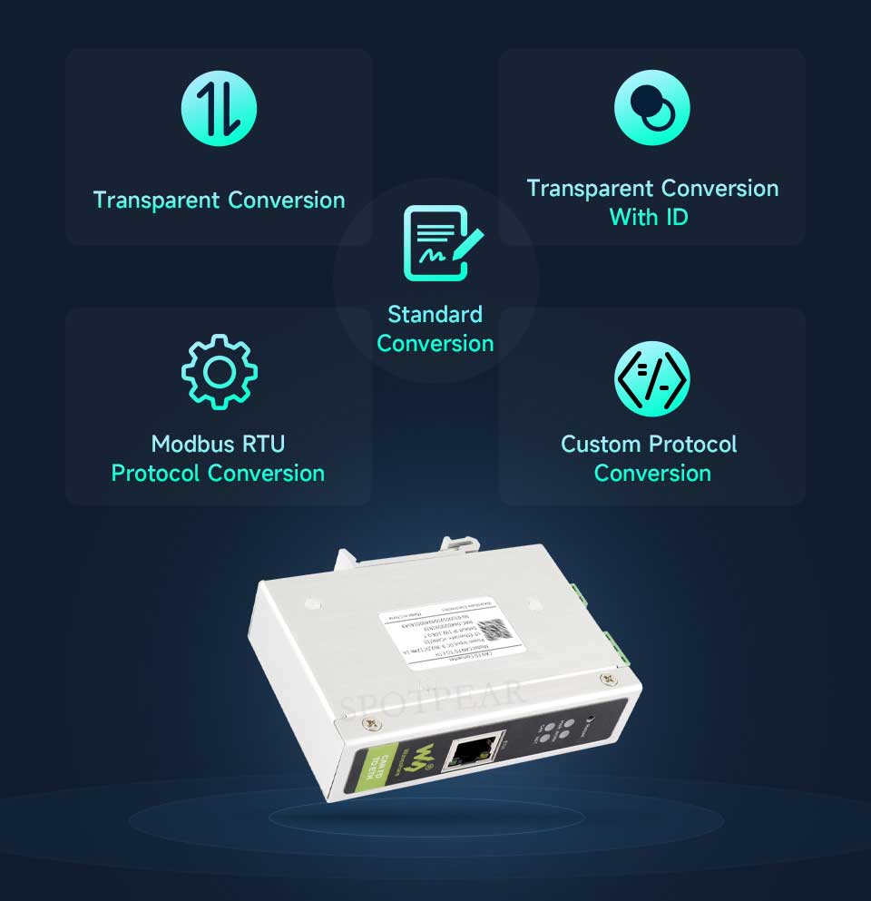 | PROTOCOL CONVERSION | Transparent conversion, transparent conversion with ID, standard protocol conversion, Modbus protocol conversion, and custom protocol conversion | |