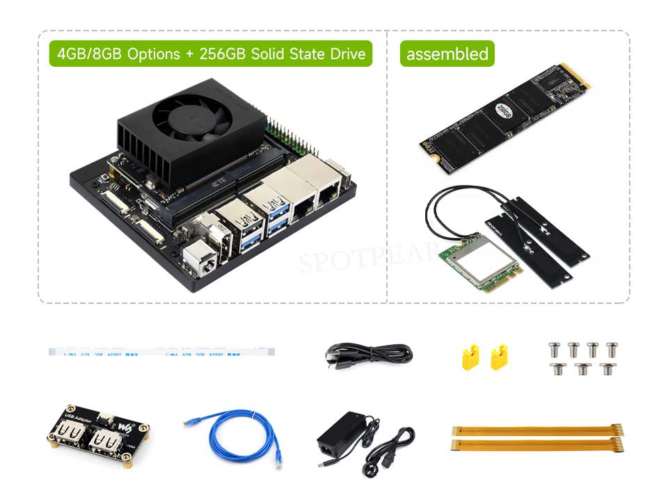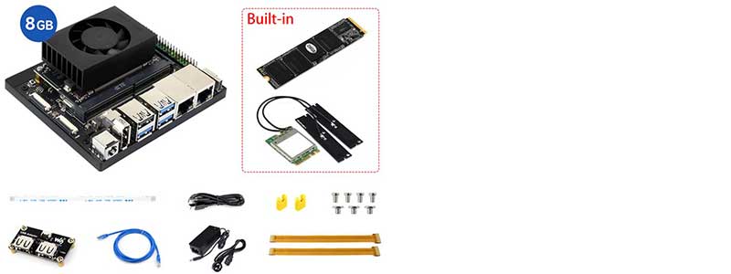 Includes Jetson Orin Nano Module (options for 4GB/8GB), JETSON-ORIN-IO-BASE-B base board, cooling fan, 256GB NVMe Solid State Drive, AW-CB375NF dual-band wireless network card, FFC cable, USB cable, USB expansion board, Network cable, power supply adapter, etc.