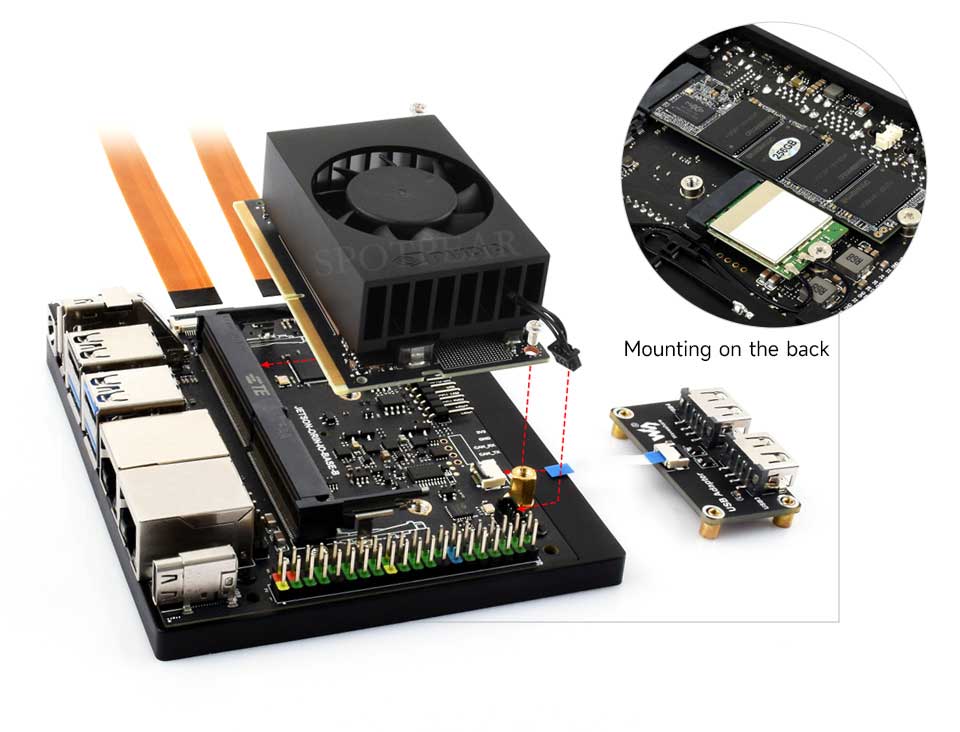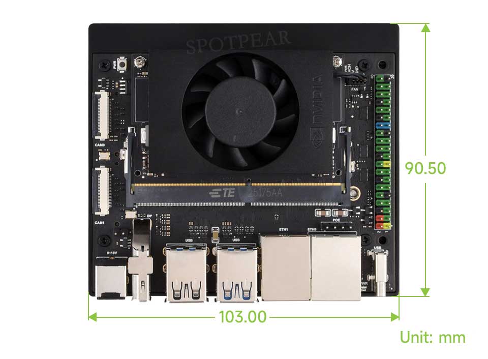 This kit includes the Orin Nano Module with options for 4GB / 8GB memory, no built-in storage module, provides up to 20 TOPS / 40 TOPS AI performance, and up to 34 TOPS / 67 TOPS after upgrading to the SUPER version. Comes with a 256GB NVMe Solid State Drive, high-speed reading/writing, meet the needs of large AI project development.