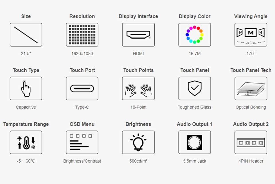 21.5inch Capacitive Touch Display, 1920×1080 Full HD, Optical Bonding Toughened Glass Panel, Supports Raspberry Pi / Jetson Nano, Etc.