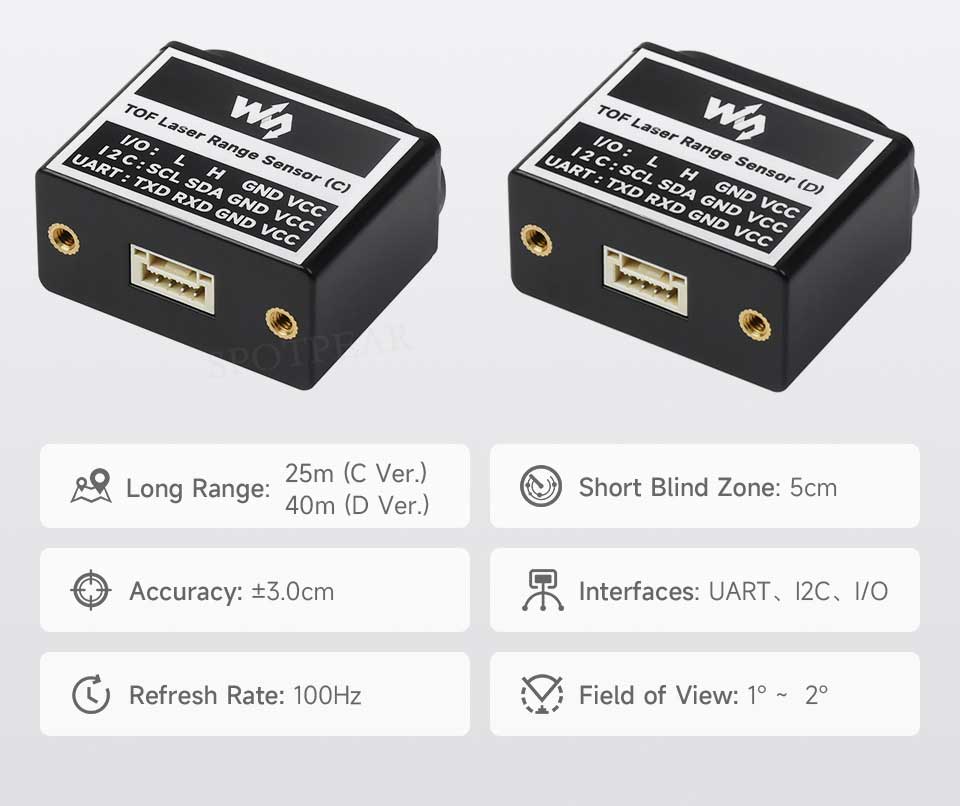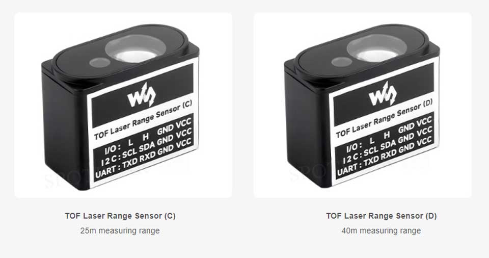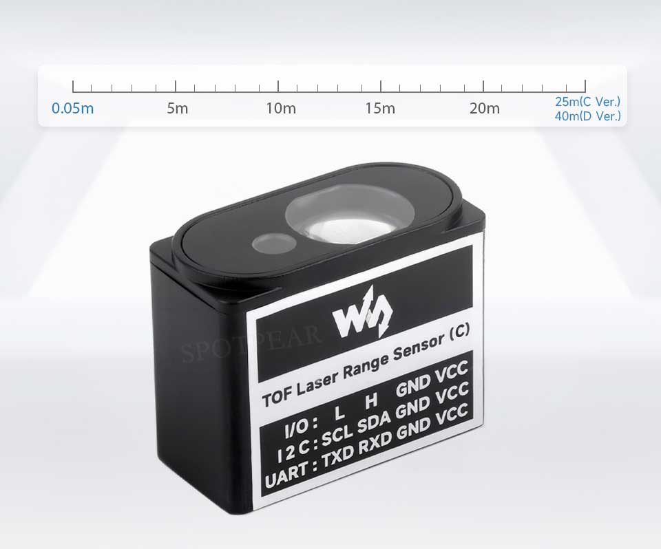 This is a TOF-based (time of flight) laser ranging sensor with embedded MCU and ranging algorithm, which is capable of offering up to 25m / 40m measuring range, and ±3cm accuracy. It supports UART or I2C communication bus, features longer measuring distance and higher light interference tolerance capability due to its ultra narrow FOV, suitable for either indoor or outdoor condition. And its ambient light tolerance is up to 100K LUX.