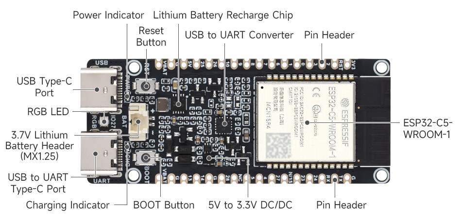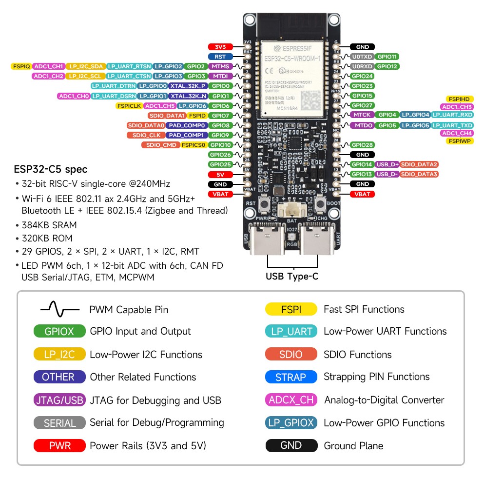 - Adopts ESP32-C5-WROOM-1 series modules, equipped with a RISC-V 32-bit processor, with a clock speed of up to 240MHz