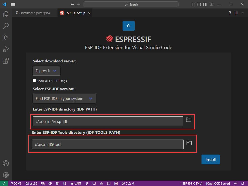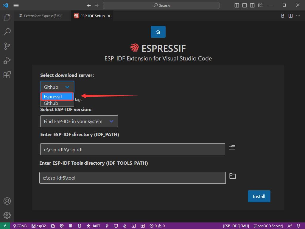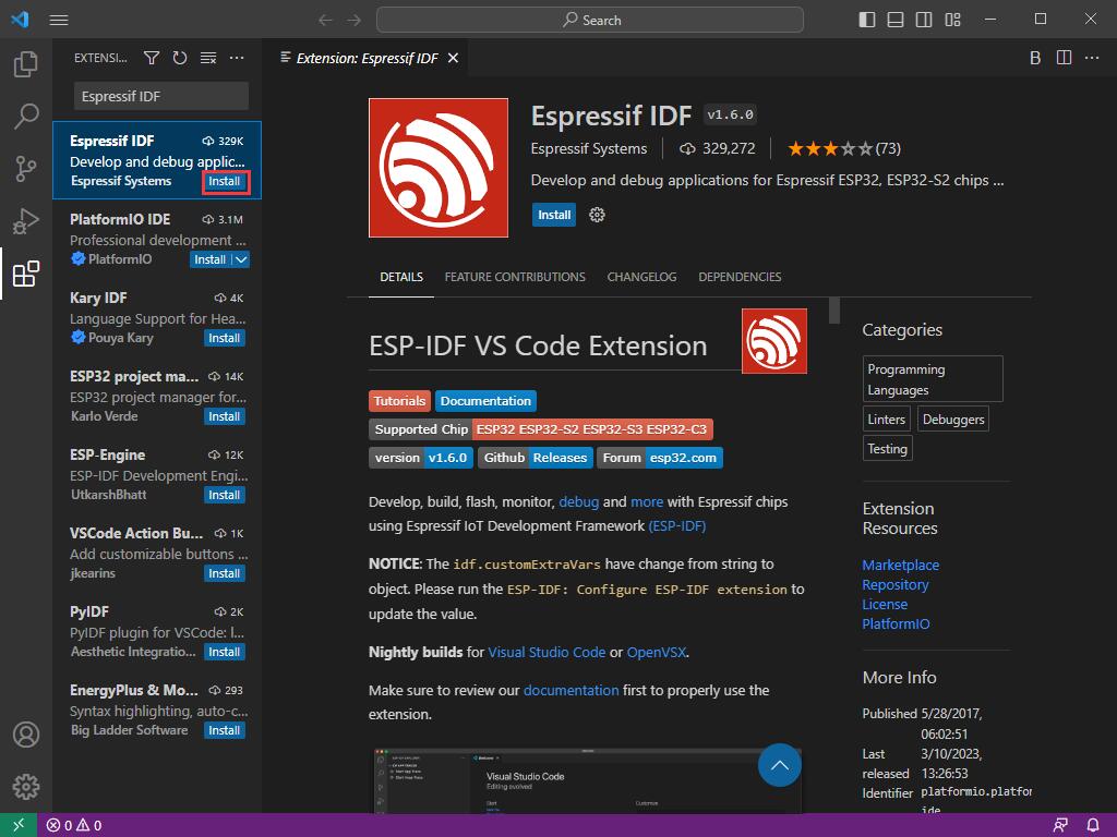 - In the search bar, enter Espressif IDF to select the corresponding plugin and click Install