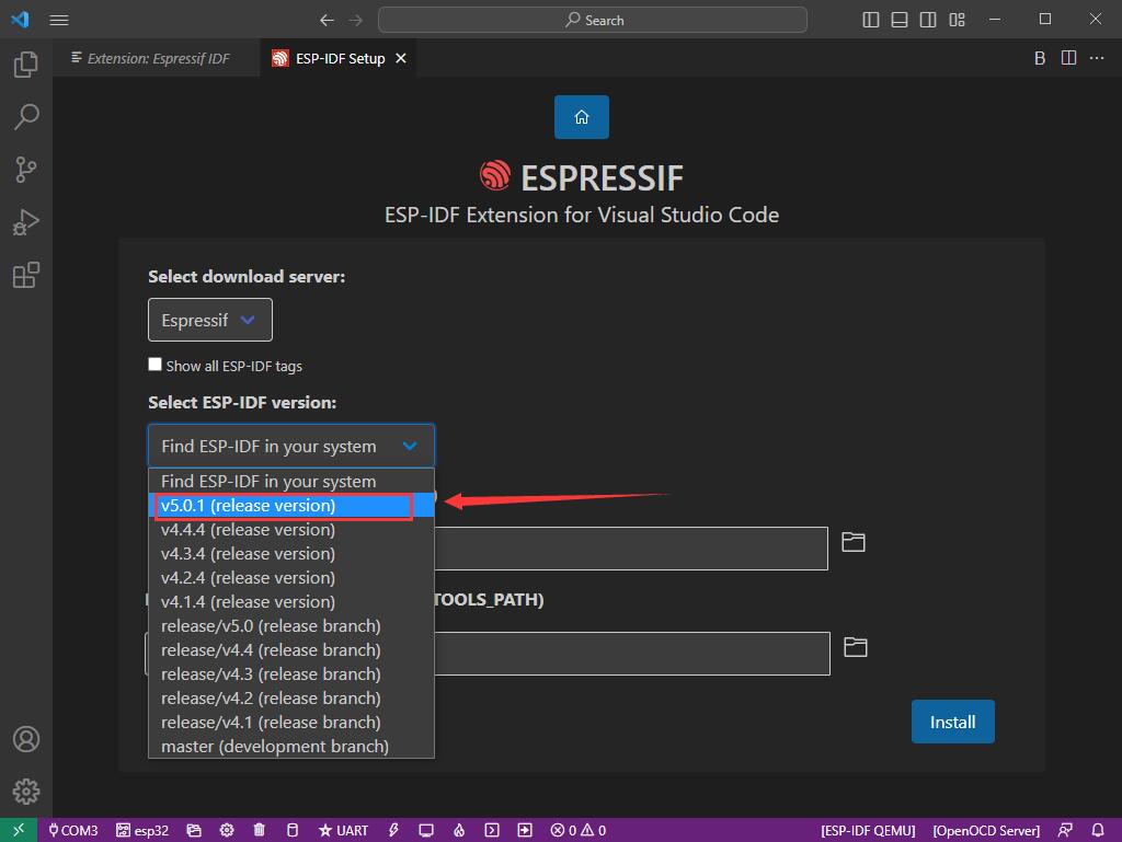 - Select the ESP-IDF version you want to download, we choose the latest V5.0.1 (note that ESP-IDF only supports ESP32-C5 after V4.4)