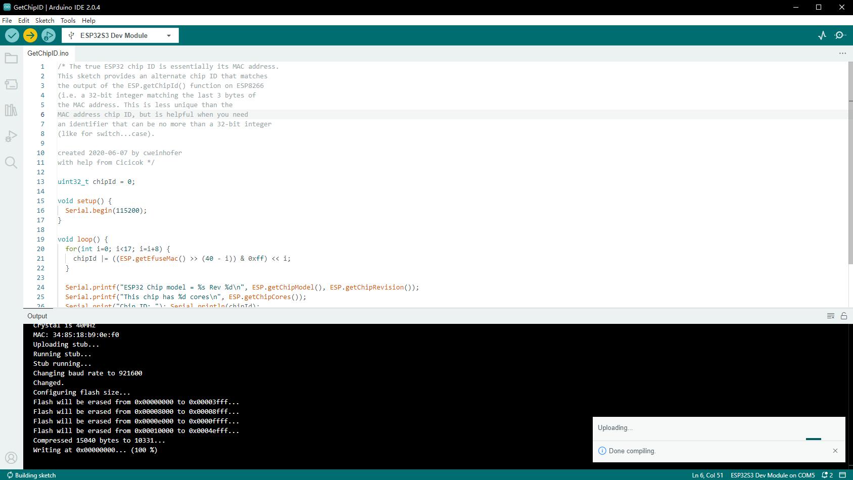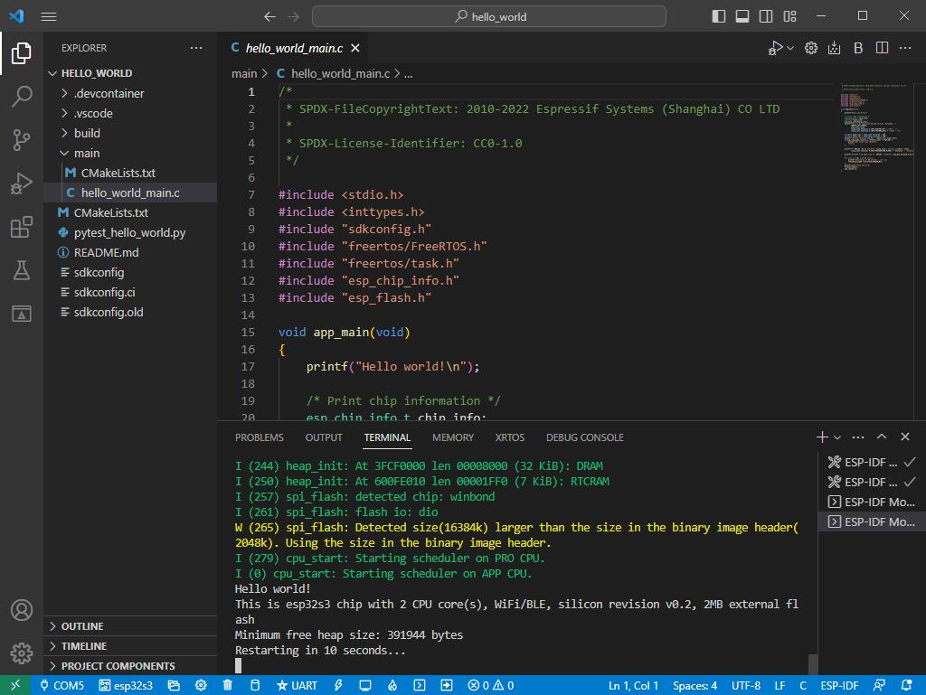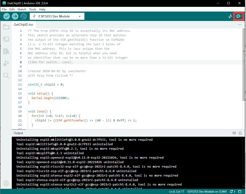 - Click on the all-in-one button we described before to compile, flash and open the serial port monitor