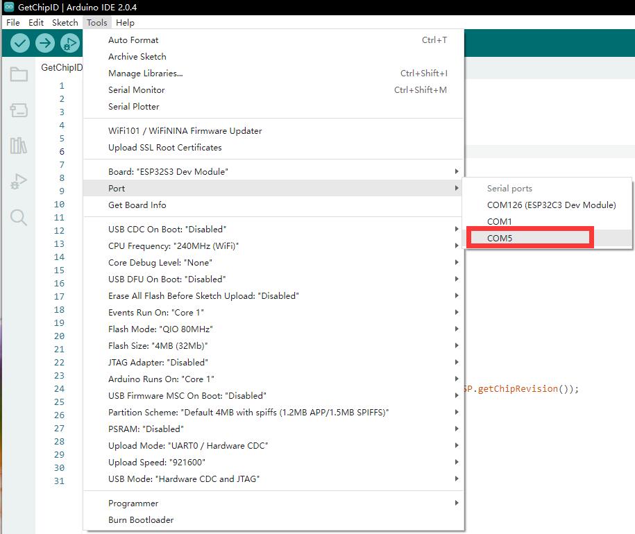 - The COM of our CH343 is COM5, so we choose COM5. Please choose the COM port corresponding to your CH343